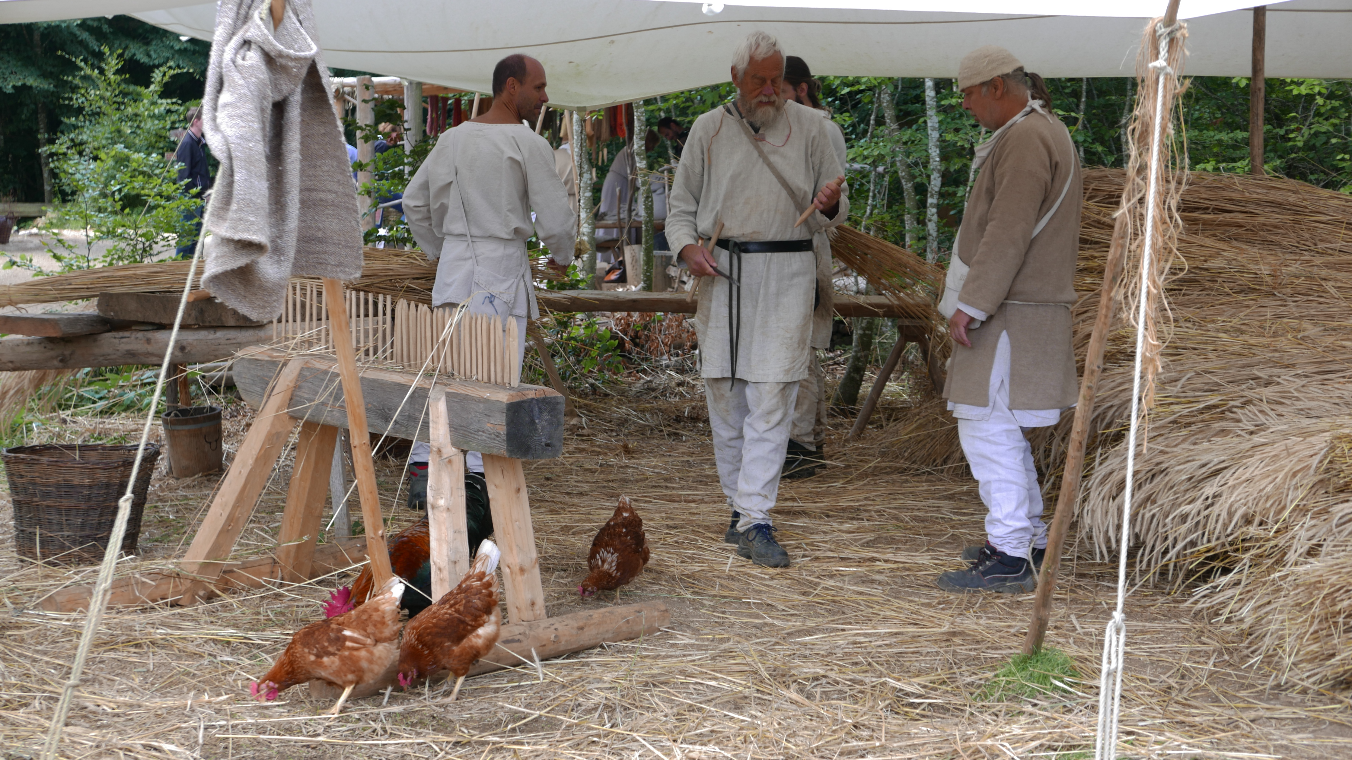 Sometimes, it is the 21st century administration which gets in their way and frustrates them to no end. It took a year to get a building permit for the barn whose huge oak beams are being hewed as I write. They were told they could not use their own rope to tie beams in place on the smaller workshops and huts because their rope doesn’t meet EU standards. They used their own rope to ring the bell.