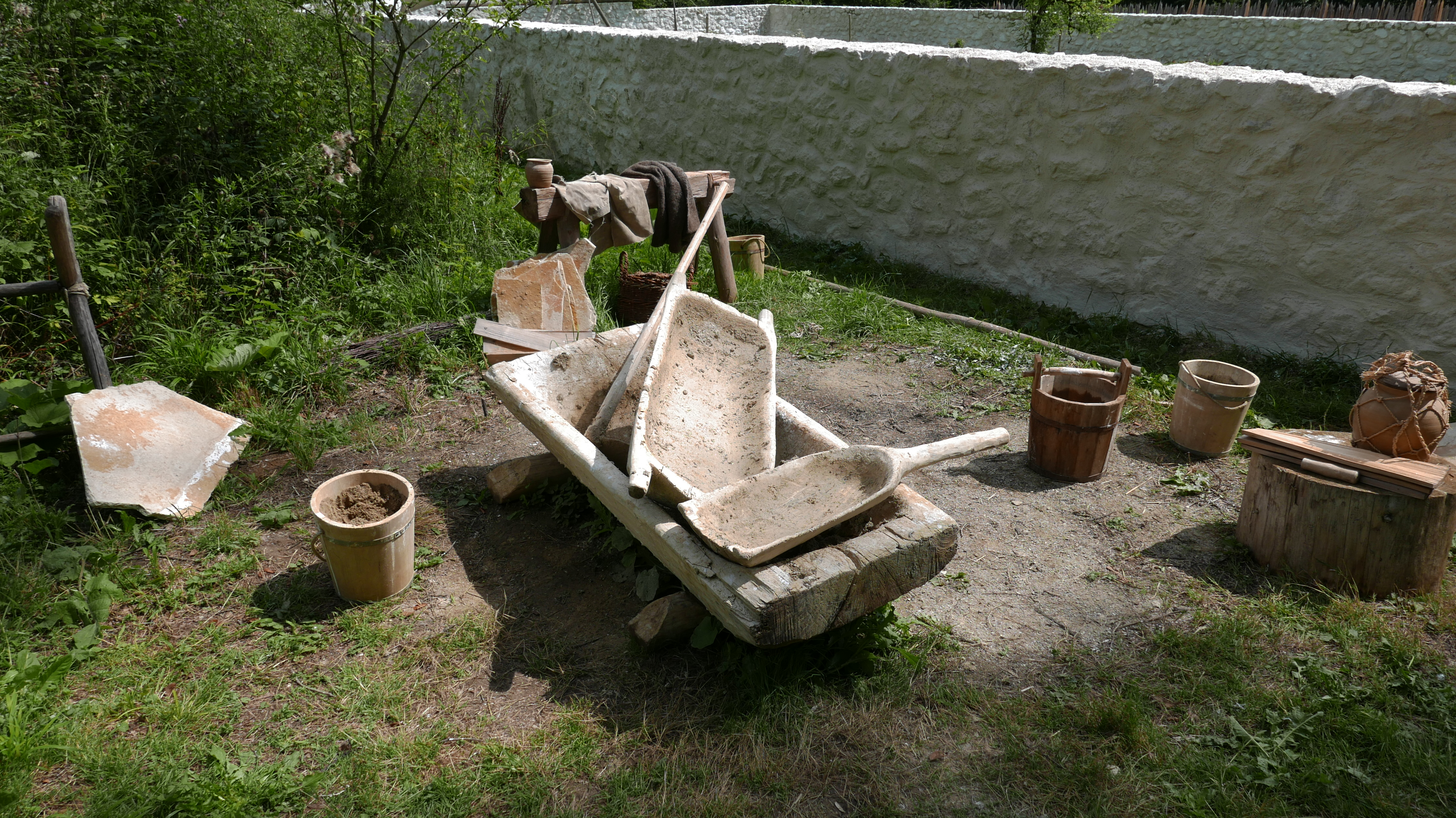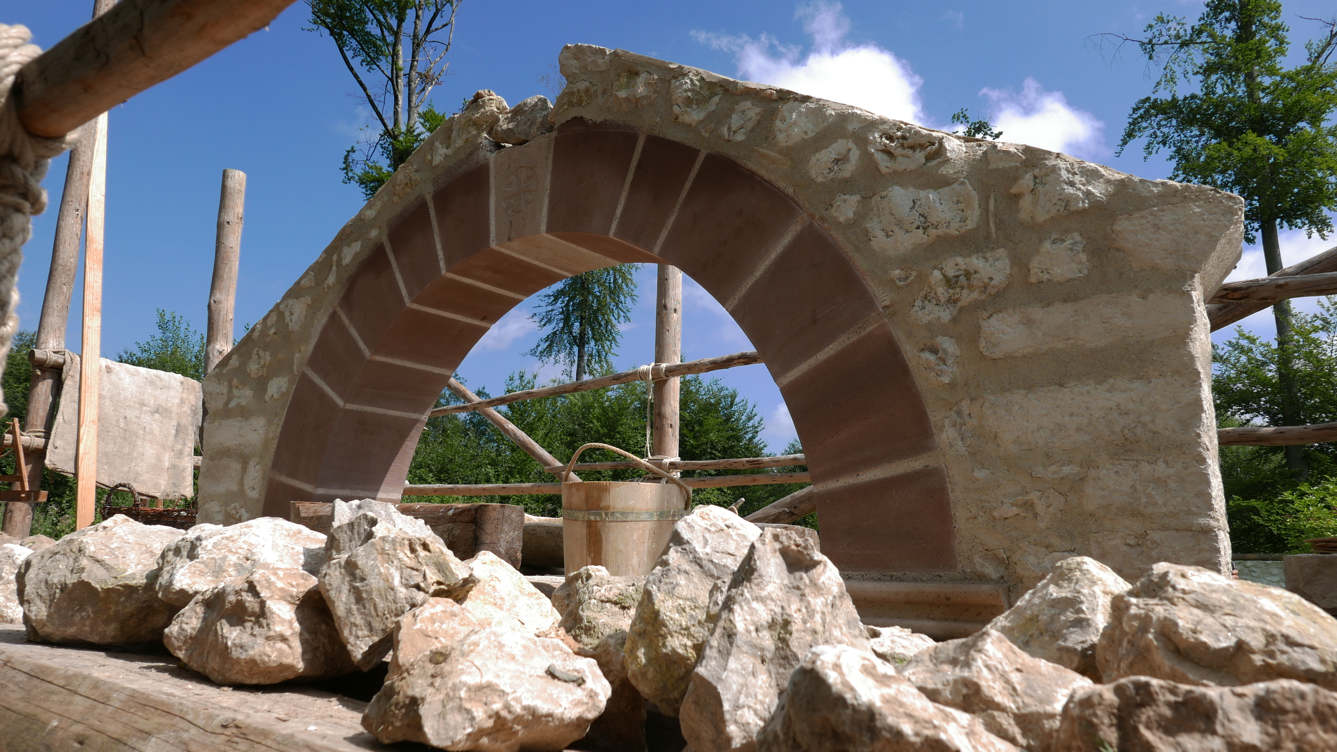 In August of this year, the first stone arch was put up at the cemetery and the walls white-washed. There are no plans to bury anybody in it. Limestone is proving troublesome as it did way back when. “The limestone has a tendency to split when it becomes wet and water enters into microscopic (natural) cracks and then frost hits the stone,” says Hannes Napierala, an archeologist at Campus Galli. “Water expands while it freezes and the stone cracks.”