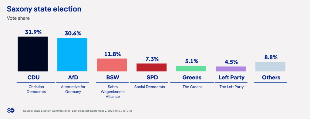 The knife attack in the western German town of Solingen by a 26-year-old Syrian asylum-seeker who killed three and injured eight one week before Sunday’s vote certainly did give the AFD’s arguments a boost. Last minute measures by the Federal government promising to impose stricter measures on asylum seekers, to increase deportations as well as impose a ban on carrying knives in public, including simple pocket knives, wasn’t enough to prevent the ‘anti-establishment‘ surge in the east.